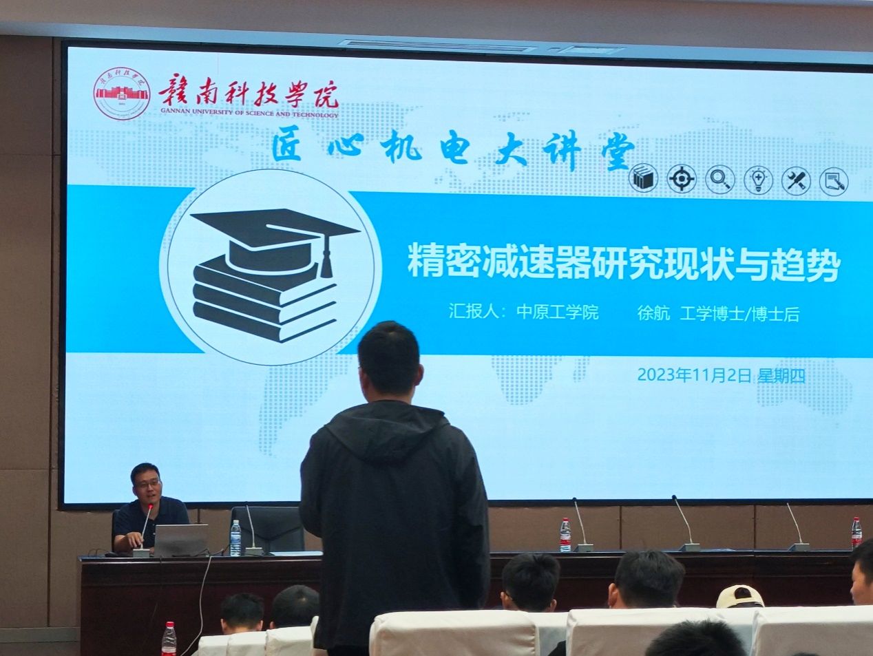 本网讯:2023年11月2日上午,中原工公司副教授徐航应邀在逸夫楼学术报告厅作了题为“精密减速器研究现状与趋势”的学术报告。报告会由机电工程系主任刘辉老师主持,师生代表200余人聆听了报告。
