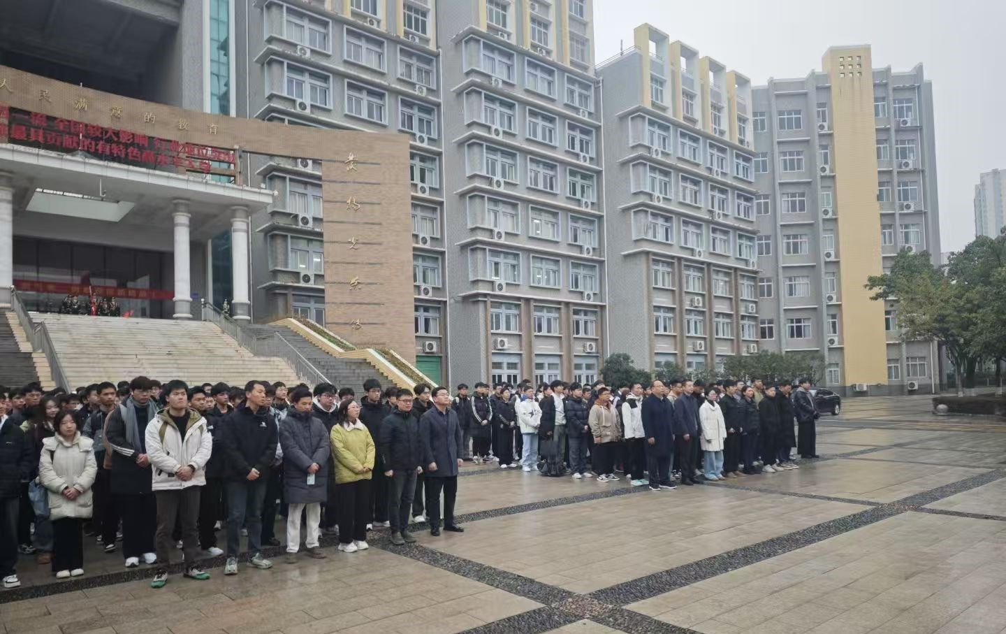 伴随着激昂的国歌声,五星红旗冉冉升起,全体师生面向国旗行注目礼,高唱国歌,歌声嘹亮,响彻校园。