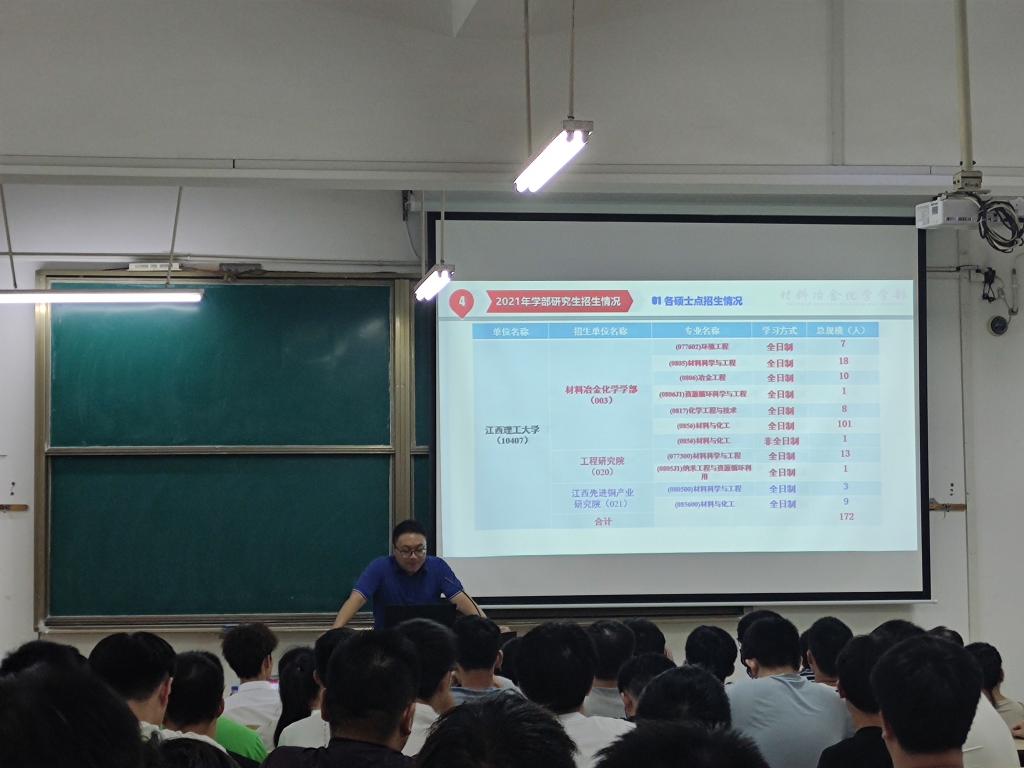 梁勇老师就江西理工大学简介、材料冶金化学学部基本情况、学部下设研究所介绍、2021学部硕士研究生招生情况四个方面进行介绍,并根据今年的总体考研形式向同学们分析了报考学部的难易程度,为在场的考研同学报考院校增加了一条有利选择。