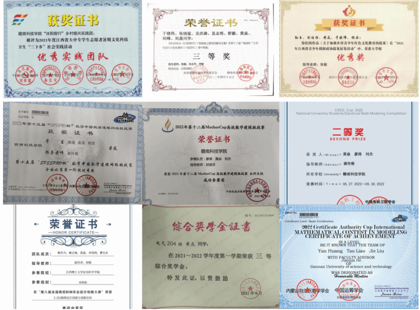 在校期间,黄焱曾获得校级一等、三等奖学金多次及普通话二乙资格证书;发表过三篇中青校园;获优秀团员荣誉称号;荣获第八届全国高校BIM毕业设计创新大赛二等奖、第十四届全国老员工电工数学建模竞赛二等奖等奖项。