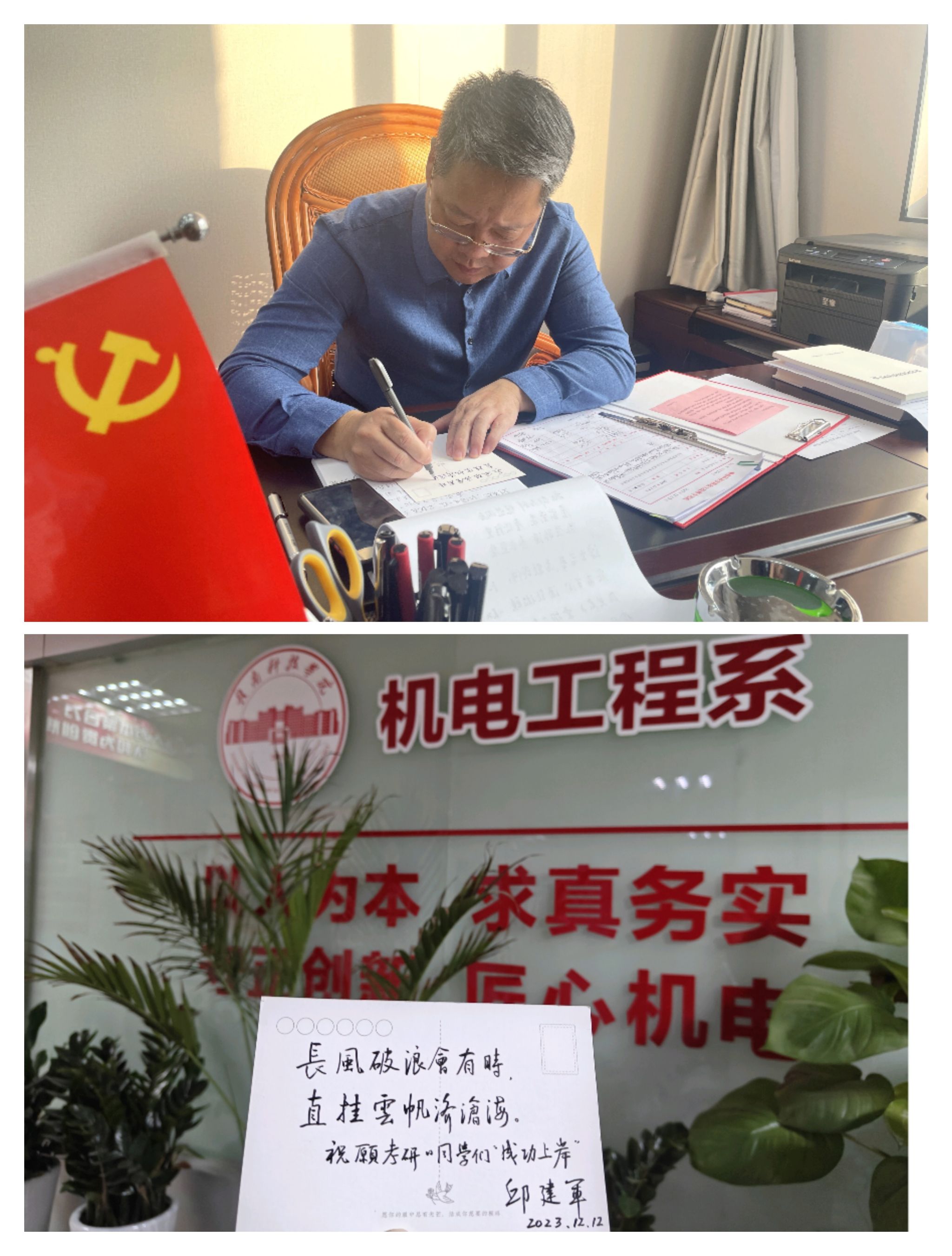 为了给考研同学们送上这份惊喜,老师和学弟学妹们精心筹备,老师们从果园亲手采摘并精心挑选脐橙,学弟学妹们准备精美包装,院、系领导及机电工程系全体教师执笔为每一位考研学子写下衷心祝福。一张张空白的纸在老师们写过祝福语后变成格外有意义的贺卡,在刚入学时,这群懵懂无知的少年也似一张张白纸,在老师们不辍的笔耕下变成一篇篇精美的华章。