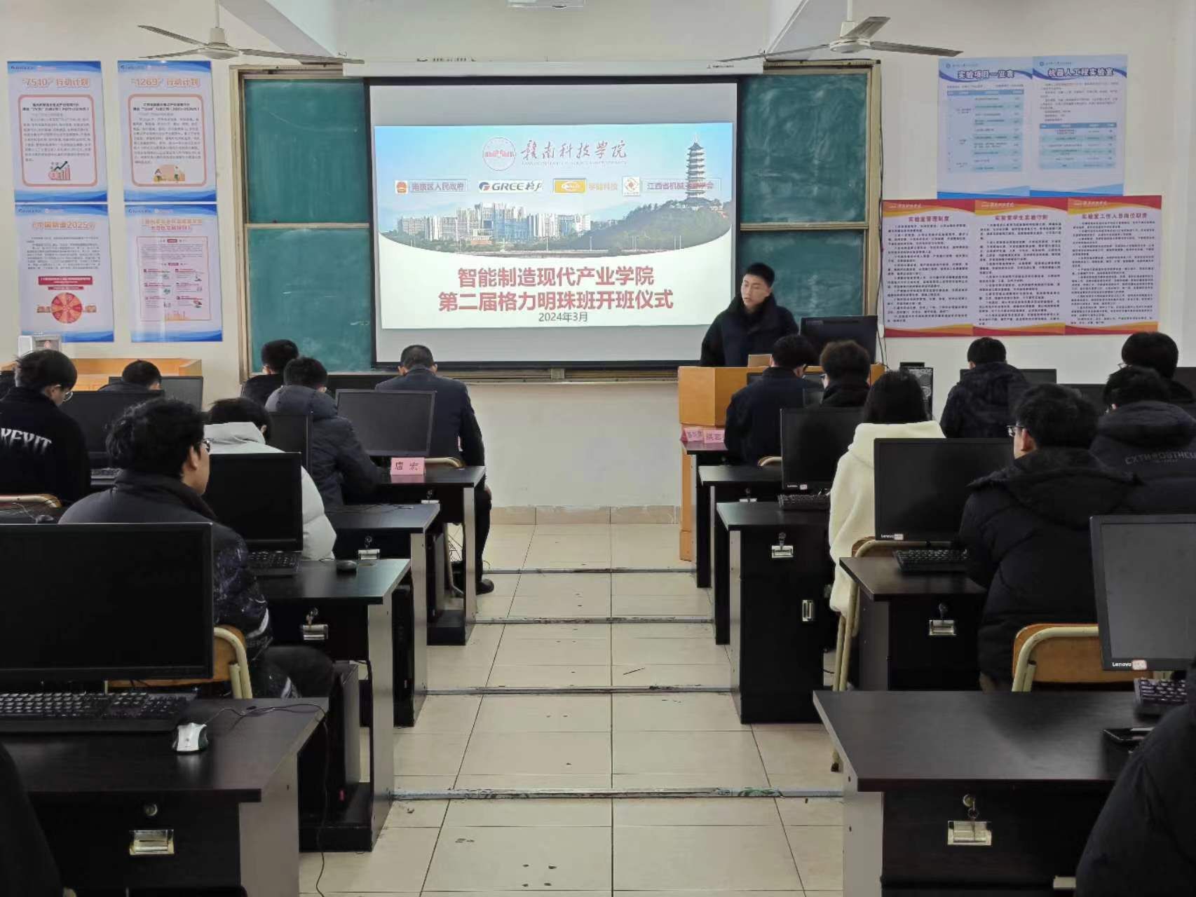 本网讯:3月4日上午,智能制造现代产业公司第二届“格力明珠班”开班仪式在工程研究院401举行。智能制造现代产业公司执行经理刘辉、副经理关开荣,格力电器(赣州)有限公司人力资源部部长洪志勇、招聘培训经理黄凯奇出席开班仪式。公司智能制造与机器人教研室主任唐宏、副主任冯凯,产业公司行政部负责人张雨,第二届“格力明珠班”班主任刘懿晨以及第二届“格力明珠班”全体同学参加活动。开班仪式由唐宏主持。